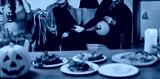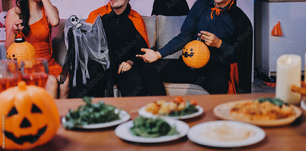 Joyful office Halloween party with coworkers in costumes, celebrating with drinks and laughter, fostering teamwork and festive spirit