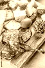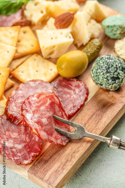 Traditional antipasto platter with salami slices, assorted cheeses, crackers, olives, and snacks served on a wooden board