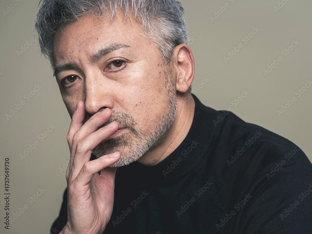 白髪まじりの髭の生えたアジア人男性のビューティーポートレート。メンズビューティー 。