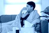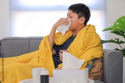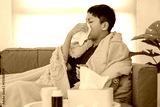 Young Asian Kid Resting on a Couch with Warm Blanket and Tissue During Cold or Flu Season