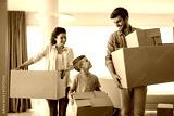 New home. Parents with child moving in new house, property mortgage and real estate investment.