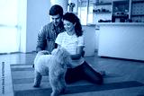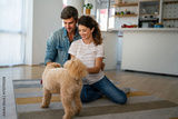 Portrait of happy multiracial couple scratching their pet dog, sitting on floor at home. Adopted pet