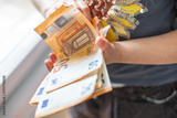 female child, cheerful girl holds 50 euro banknotes close-up, imagination ignited power money, financial awareness, happy youngster