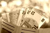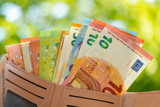 euro bills in wallet, cash euro money, natural outdoor setting, currency display, exchange and cashing currency, European economic, summer outdoor, financial planning, female lifestyle