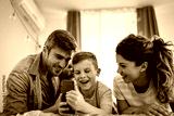 Happy technology addicted family parents and kid use laptop phone digital tablet at home,