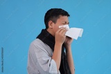 Asian Boy Blowing Nose with Tissue, Feeling Unwell and Sick with Cold Symptoms on Blue Background