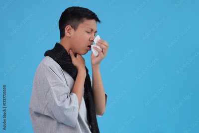 Young Boy Experiencing Cold Symptoms, Holding Tissue to His Nose and Touching Sore Throat
