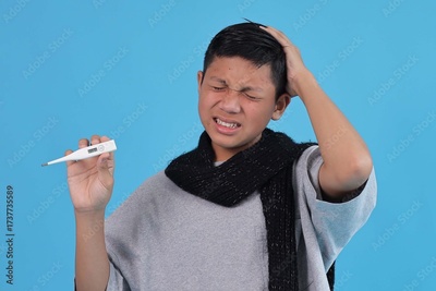 Young Boy Holds Thermometer Showing Feverish Temperature While Clutching Head in Discomfort