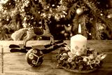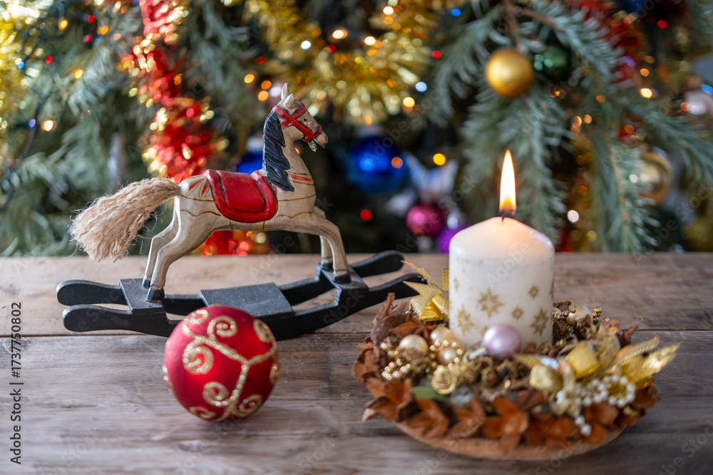 vintage rocking horse, candle against decorated Christmas tree with garlands, family tradition, nostalgia Christmas Eve, cozy holiday scene