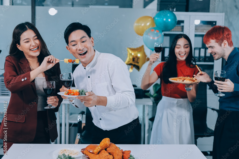 Diversity, dinner and group of people toast celebration together at party. Friends, happy and celebrate with food, wine and friendship for love, support and cheers champagne at business function