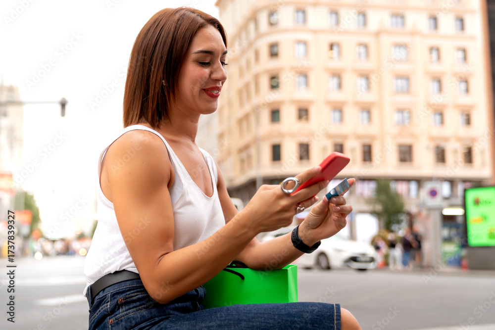 Happy woman sitting outdoors using smartphone and credit card for online shopping