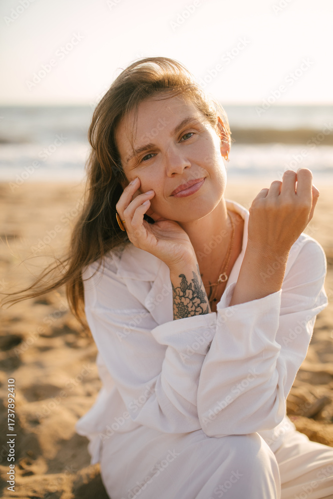 Beautiful 40 years old woman relaxing on the beach at sunset.