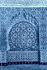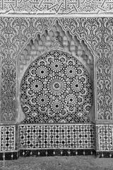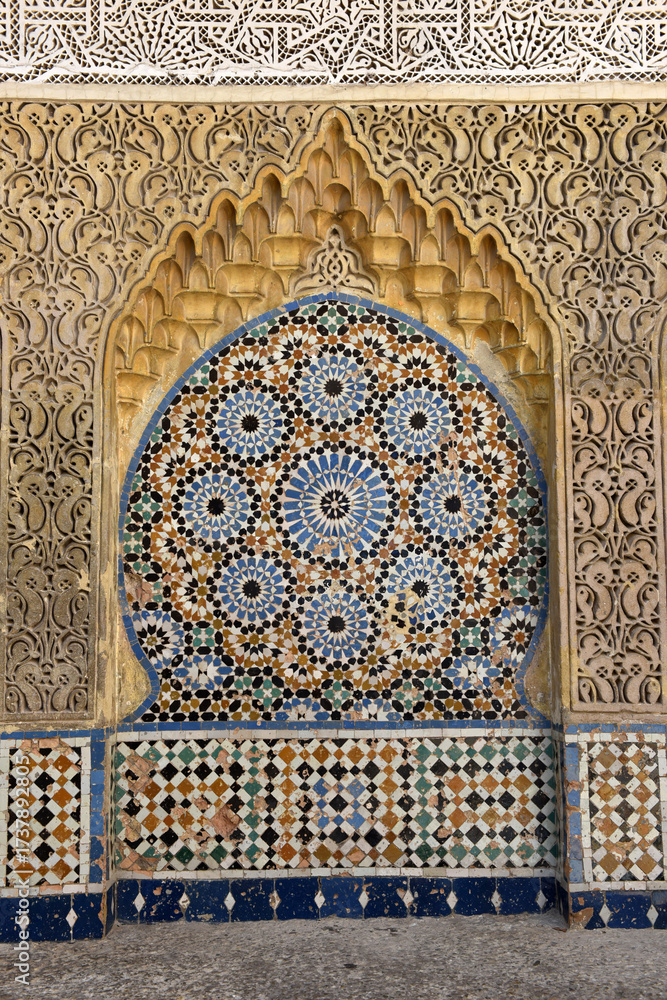 Ornamental and colorful arabesque carvings, mosaic tiles, zellige, medina of Tangier, Morocco