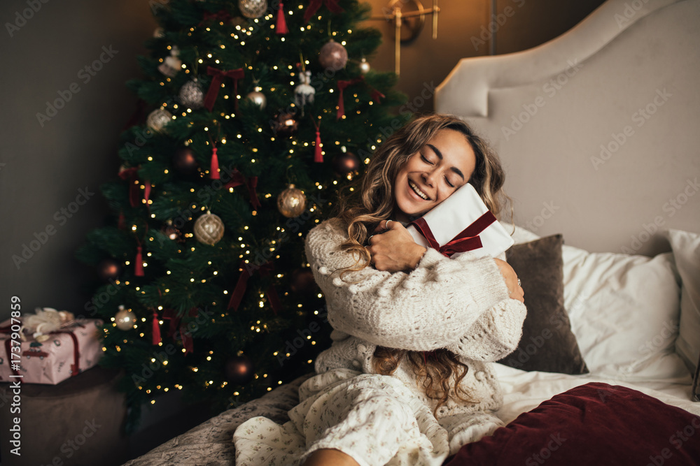 Young beautiful woman with long curly hair sitting on a bed near Christmas tree, holding present.