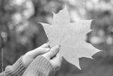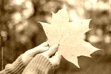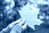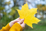 Bright yellow maple leaf held gently in female hand, soft bokeh background, cozy sweater sleeve, seasonal beauty, autumn mood concept, seasonal connection, Celebrating season’s change, Cozy fall vibes