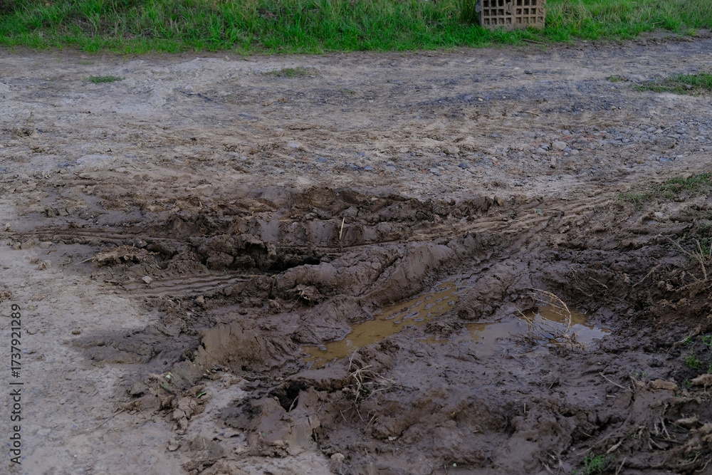 Muddy road with deep vehicle tracks after heavy rain and melting snow, Deep tire tracks in wet, muddy slush, Muddy terrain with tire impressions, challenges of off-road environments