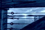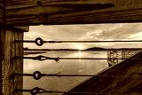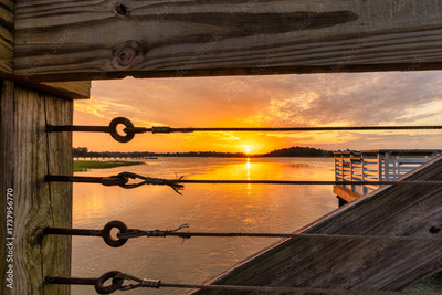 Captivating sunset over tranquil waters seen through wooden railing at a riverside