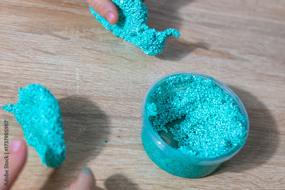 child's hands shaping soft foam clay, creativity and sensory play in early childhood development, fine motor skills, playful moment
