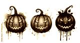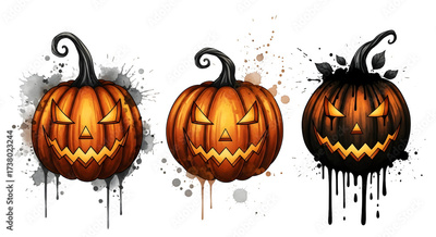 Three carved pumpkins with spooky faces and paint splatters isolated on transparent background