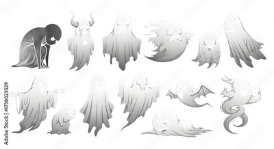 Assortment of spectral ghosts and spirits in various forms isolated on transparent background