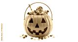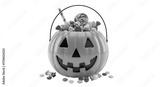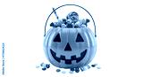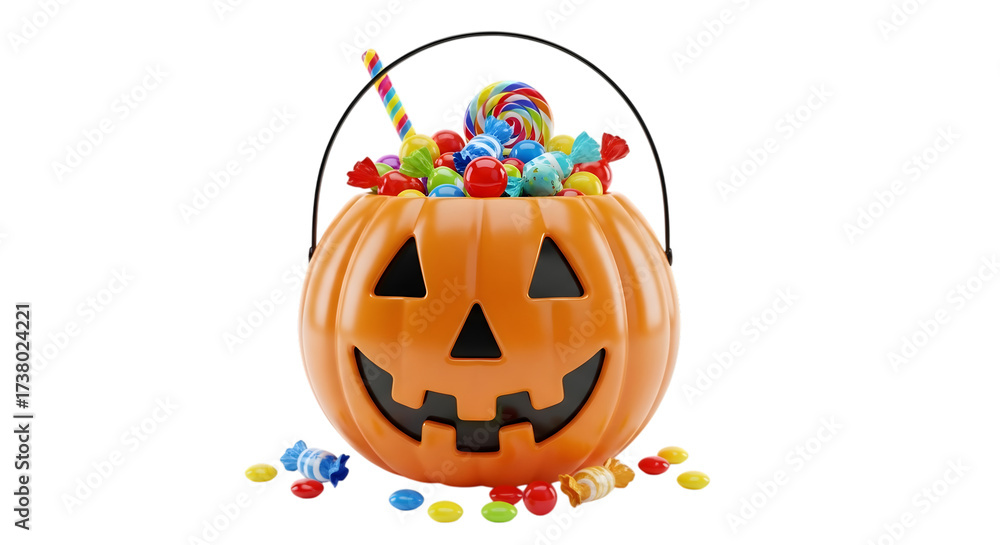 Halloween pumpkin candy bucket filled with assorted sweets isolated on transparent background