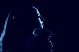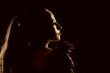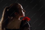 Profile portrait of a young pensive girl with a flower in a dark room.