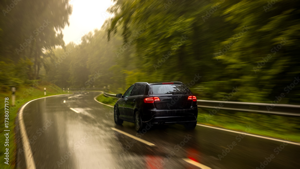 Ein Auto fährt schnell auf einer nassen Straße und es regnet stark im Herbst