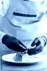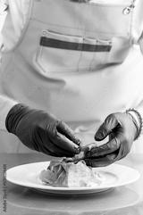 Chef garnishing gourmet dish with red vegetable on green wrap, wearing black gloves and apron in professional kitchen. Culinary plating, fine dining, food styling concept.