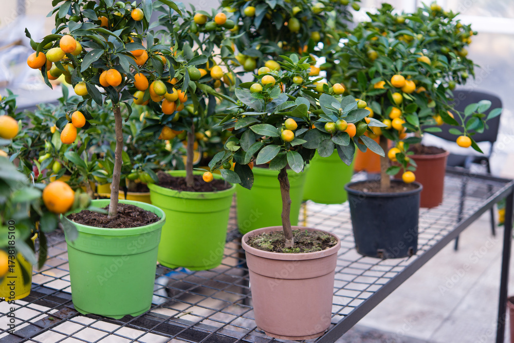 Small tree orange fruit and green leaves growing in a pot. Miniature decorative trees orange oranges in greenhouse