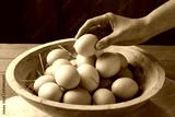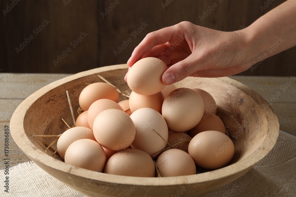 Woman taking raw chicken egg from bowl at wooden table, closeup