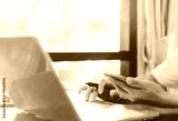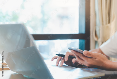 Hand using smartphone and working on laptop at home office. Concept of remote work, digital communication, and multitasking technology in modern business environment.Business women woking online