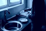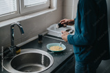 A close-up of an individual preparing scrambled eggs on a kitchen counter. The bright and natural lighting enhances the casual atmosphere of a standard household kitchen setting.