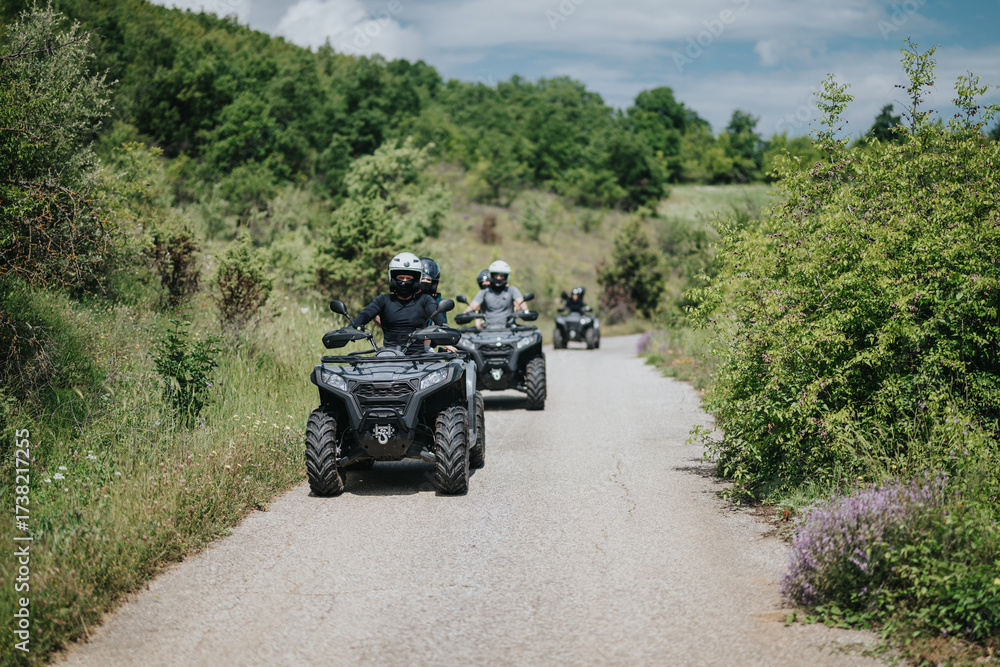 Adventurous activity with friends riding quad bikes through a lush countryside landscape.