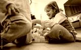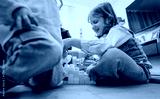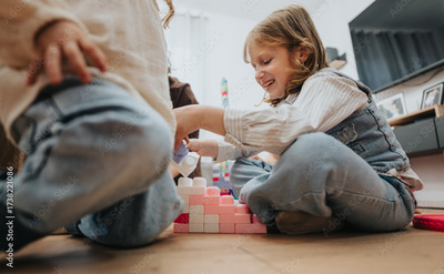 Two smiling children playing together indoors, constructing a colorful tower with building blocks.