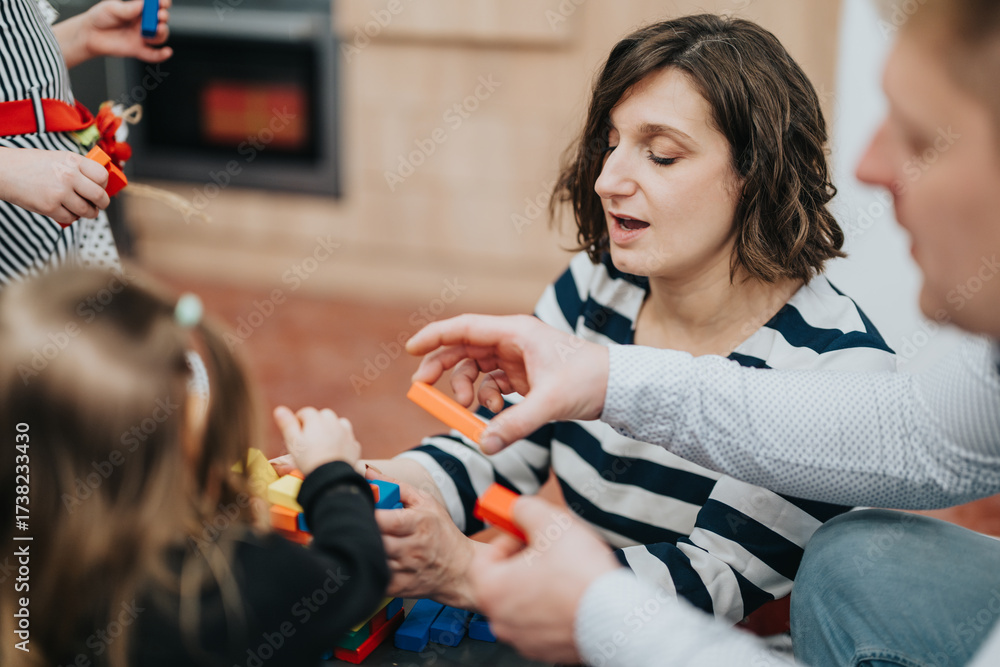 Family members interact while building with blocks, sharing creativity and time together indoors.