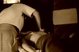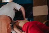 A massage therapist performing a relaxing back massage for a customer lying on a table covered with a red blanket in a peaceful and soothing environment.
