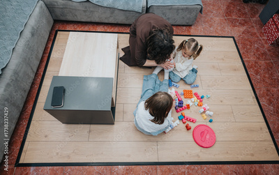 Parent and two children spend quality time in a cozy living room playing with colorful building blocks. This image depicts family bonding, creativity, togetherness and childhood fun in a home setting.