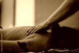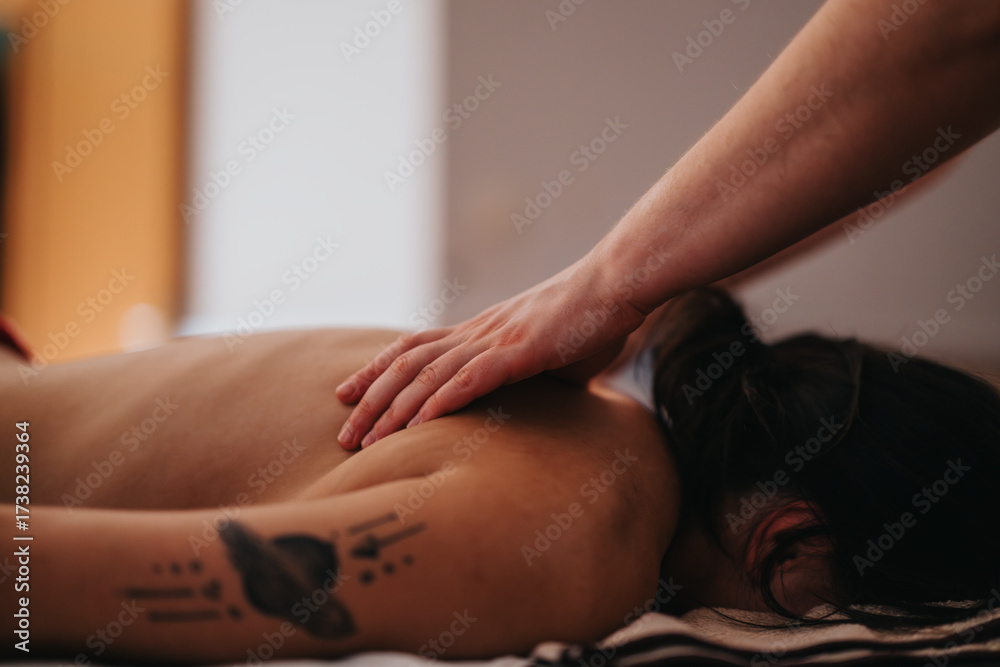 A person receives a soothing back massage, emphasizing relaxation and wellness in a tranquil environment. The tattooed arm adds a unique touch, symbolizing individuality and artistic expression.