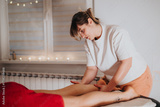 A professional massage therapist performing a leg massage, creating a relaxing and rejuvenating experience in a calming and well-lit setting, emphasizing wellness and care.