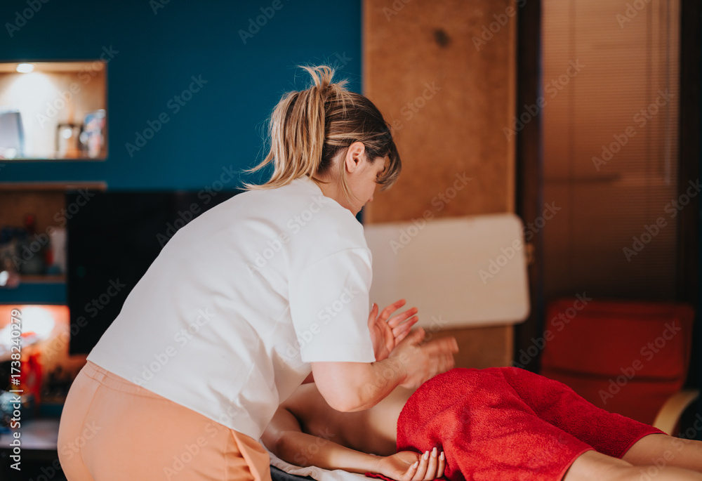 A professional massage therapist gives a relaxing back massage in a peaceful treatment space.
