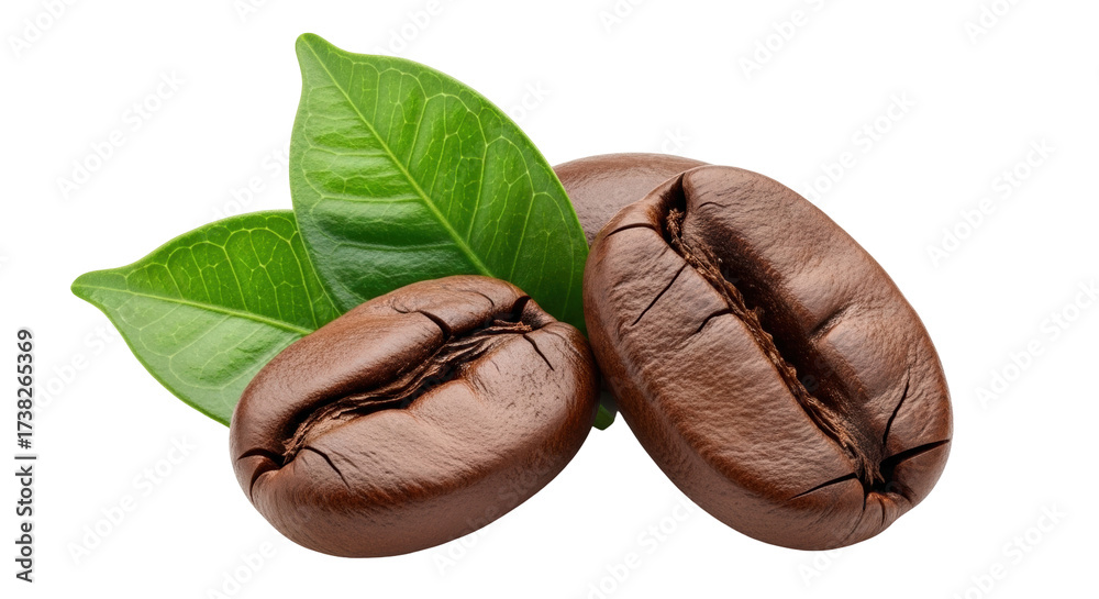 Isolated aromatic coffee beans with fresh green leaves for a rich brew preparation