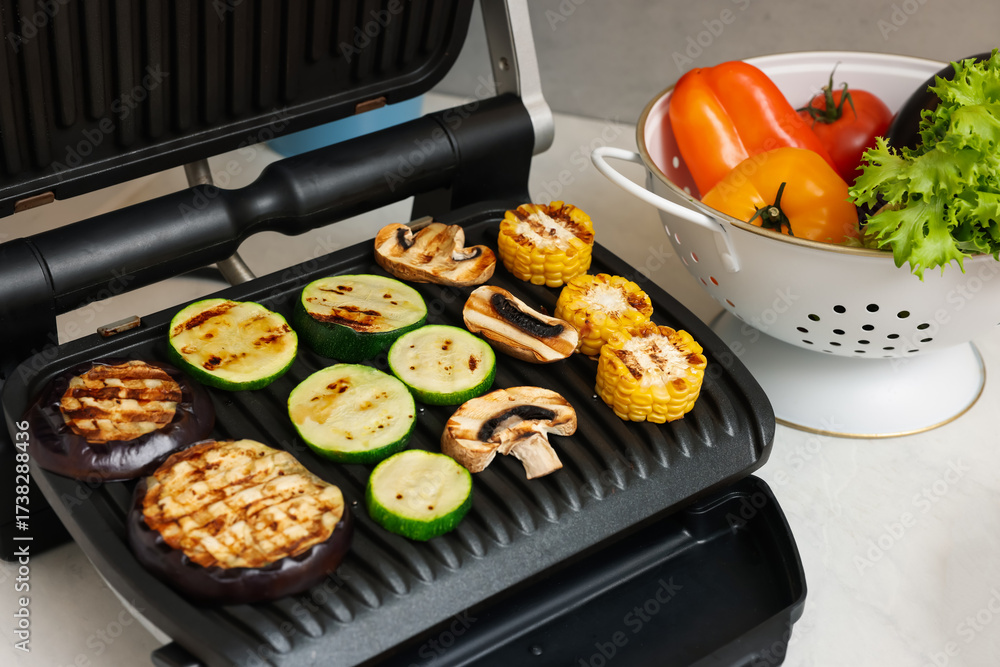 Electric grill with vegetables and mushrooms table, closeup