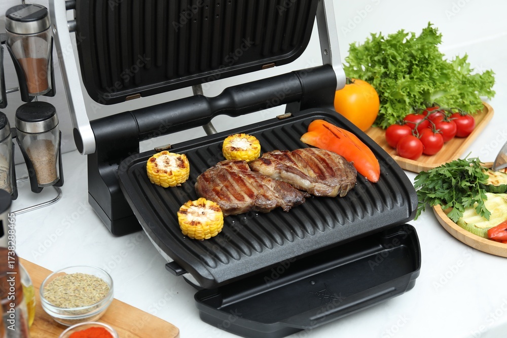 Electric grill with tasty meat, vegetables and spices on white countertop indoors