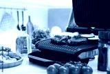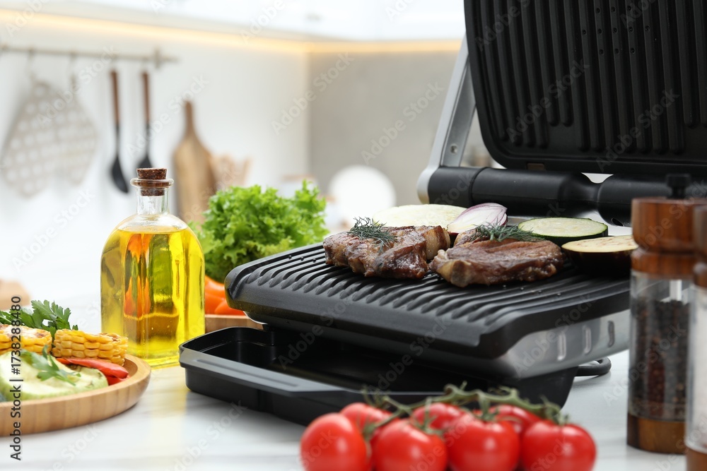 Electric grill with tasty meat, vegetables and spices on white marble table in kitchen