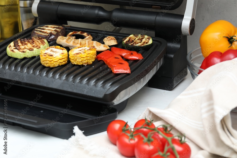 Electric grill with tasty meat and vegetables on white table, closeup
