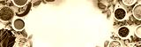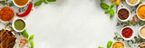 A wide selection of cooking spices and herbs on a gray background, perfect for adding depth to any dish, top view and copy space, banner