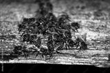 Close-up of honey bees clustering at the entrance of an old wooden beehive, highlighting their detailed wings, bodies, and social interaction in natural light.