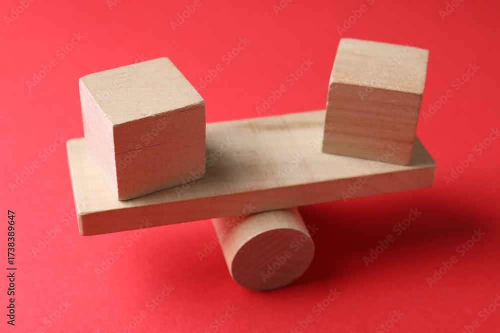 Risk. Wooden seesaw scale with cubes on red background, closeup