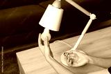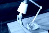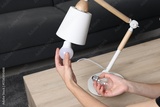 Woman changing light bulb in lamp at wooden table indoors, closeup