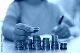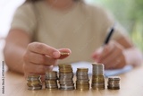 Woman counting coins at wooden table indoors, selective focus